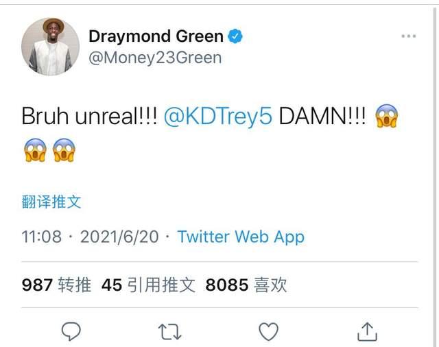 而同样是杜兰特曾经队友的格林同样是在社交媒体上表达了自己对于杜兰特的赞美之情,格林认为杜兰特的表现太不真实了。相信不少球迷还记得格林和杜兰特之间的矛盾,当初在勇士的时候,格林和杜兰特之间曾经发生过不少口角之争,而格林也成为了杜兰特离开勇士的导火索。如今看见杜兰特这样神奇的表现,而勇士则是早早无缘季后赛,相信格林也后悔了自己为什么要骂杜兰特。