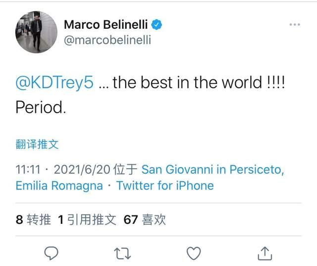 同时还有贝里内利,他直言杜兰特就是世界上最好的球员,他认为杜兰特就是一个划时代的球员。这样的称赞是很高的,毕竟很少有球员配得上这种称呼。杜兰特在第四节最后时刻命中的那个翻身跳投简直就是神来之笔,谁都想不到这么艰难的球居然都可以命中。虽然篮网最终还是输掉了系列赛,但是杜兰特的表现却已经足以证明了他就是季后赛当中表现最好的球员。