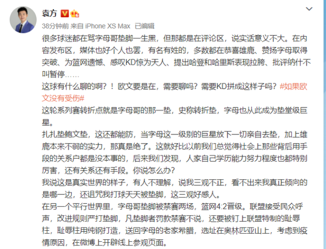 比赛结束后,各路名嘴媒体纷纷称赞杜兰特的伟大,并开始展望雄鹿队接下来的东决之旅,不过名嘴袁方却另辟蹊径的开始抨击字母哥了。