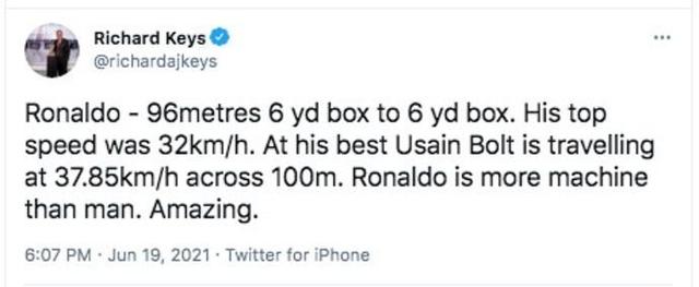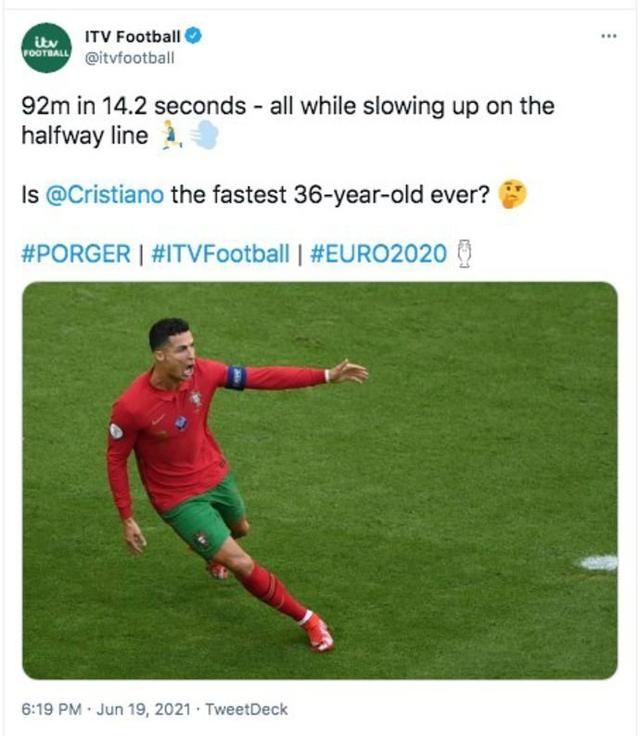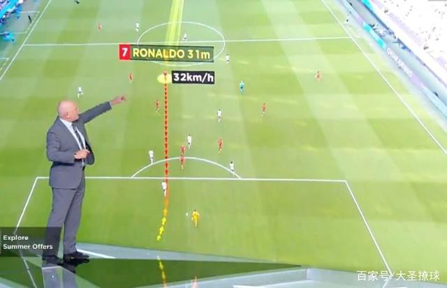 ITV Sport表示虽然在球场的进攻三区速度有所下降,C罗在14.2秒的时间里跑动了92米的距离。