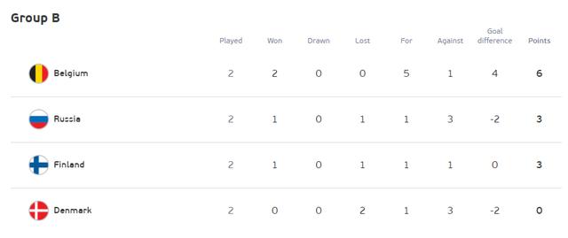 目前,B组两战过后,比利时2战全胜积6分排在小组第一位,俄罗斯和芬兰皆1胜1负积3分,因为胜负关系分列2、3位。丹麦两战全负,0分垫底。