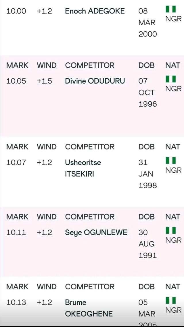 北京时间6月18日消息,在尼日利亚田径锦标赛男子100米决赛比赛中,05年小将奥吉翁希尼实力火爆,在顺风+1.2米/秒的情况下创造出了10秒13的好成绩,获得此次比赛的第四名,未能获得奖牌。但是,这个成绩成功打破了当今10秒15的世界少年纪录,令人惊喜!而另一位00年小将阿德柯可不负众望,刷新了个人最佳成绩,凭借10秒整的成绩,获得比赛冠军,成功达标东京奥运会的参赛标准。