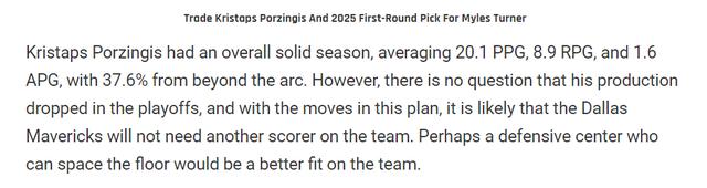 最后美媒Fadeaway World给出建议:用波尔津吉斯和2025年首轮选秀权换盖帽王迈尔斯-特纳。
