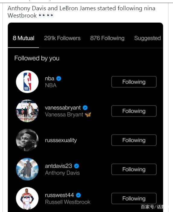 根据最新消息报道,在社交媒体上,湖人队两名当家球星詹姆斯、戴维斯今天都已经关注了威斯布鲁克的妻子妮娜-威斯布鲁克。这一信息,被视为是詹姆斯和戴维斯招募威少到湖人队一起打球的开端。接下来,湖人队将和奇才队进入实质性的谈判中,找到一个彼此都能接受的方案。