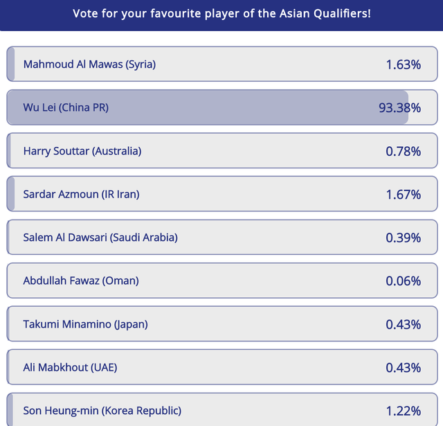 亚足联还在文章中提到,武磊是中国男足晋级“12强赛”的关键先生,他的4场5球2助攻在球队当中起到非常重要的作用。众所周知,武磊在西乙联赛陷入低迷,长时间成为西班牙人队的替补球员。但是,他的留洋生涯并没有荒废,返回到中国男足即可尽情发挥。而且,他身边的球员已经从杨旭换成阿兰、蒋光太等归化球员。所以,他能够在队友的协助之下,完成自己高效的进球。如今,武磊领先孙兴慜、阿兹蒙和南野拓实等球员,以93.38%的票数暂列榜首的位置。
