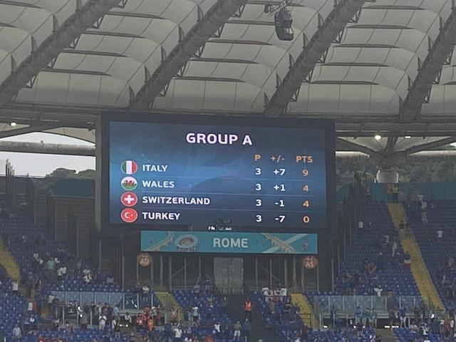 最终,意大利1-0战胜威尔士,豪取小组赛3连胜,以A组第一的身份晋级16强。威尔士虽然落败,但也依靠净胜球优势幸运击败瑞士获得小组第二,同样成功直接出线。因此尽管此战输球,依然在场内外狂欢庆祝。