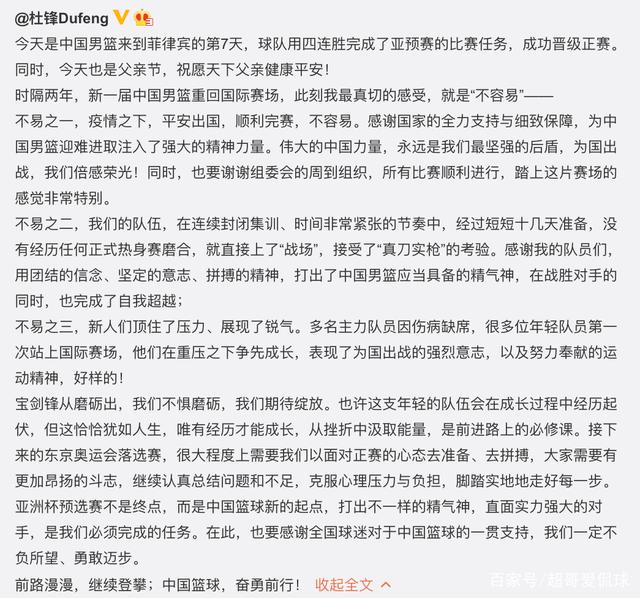 尽管奥运落选赛难度极大,中国男篮的前景暗淡,但主帅杜锋还是坚信中国篮球可以走出这个低谷,打完亚预赛之后,特意发文说道:“宝剑锋从磨砺出,我们不惧磨砺,我们期待绽放。也许这支年轻的队伍会在成长过程中经历起伏,但这恰恰犹如人生,唯有经历才能成长,从挫折中汲取能量,是前进路上的必修课。接下来的东京奥运会落选赛,很大程度上需要我们以面对正赛的心态去准备、去拼搏,大家需要有更加昂扬的斗志,继续认真总结问题和不足,克服心理压力与负担,脚踏实地地走好每一步。”