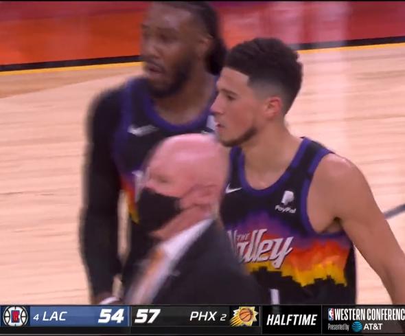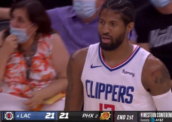 暂停回来,快船上了贝弗利盯防布克,祖巴茨也上来对位艾顿,但快船拿分还得靠乔治,一个大后撤步三分飚中,梦回巅峰啊!