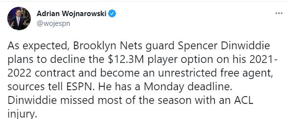 不过值得注意的是,丁威迪此前因为十字韧带撕裂赛季报销,这个赛季只打了3场比赛,可以说整个赛季都没有怎么打过比赛。而他还没复出就放弃千万年薪,这也是很自信。不知道重伤回来的丁威迪能够签回怎么样的合同呢?如今他选择离开篮网,变成自由球员,又会加盟那一支球队呢?又或者说,篮网是否会用更大的合同签回他呢?这一切都说不定。
