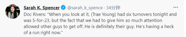 谈到特雷-杨的表现,他表示:“当你看数据的时候,特雷-杨有6次失误,且23投5中,但我们必须给予他更多关注的事实给了其他球员更多的机会。他一定是老鹰的当家球星。现阶段他打得很好。”