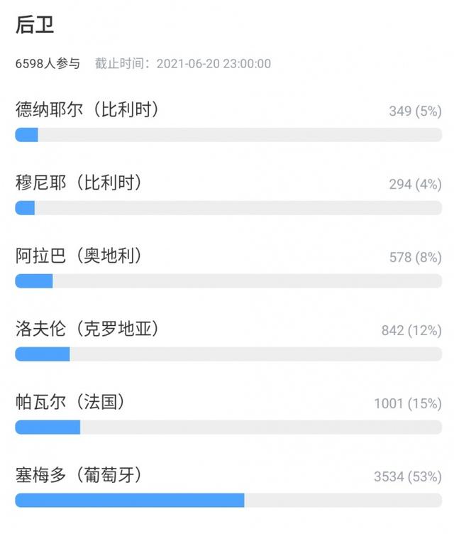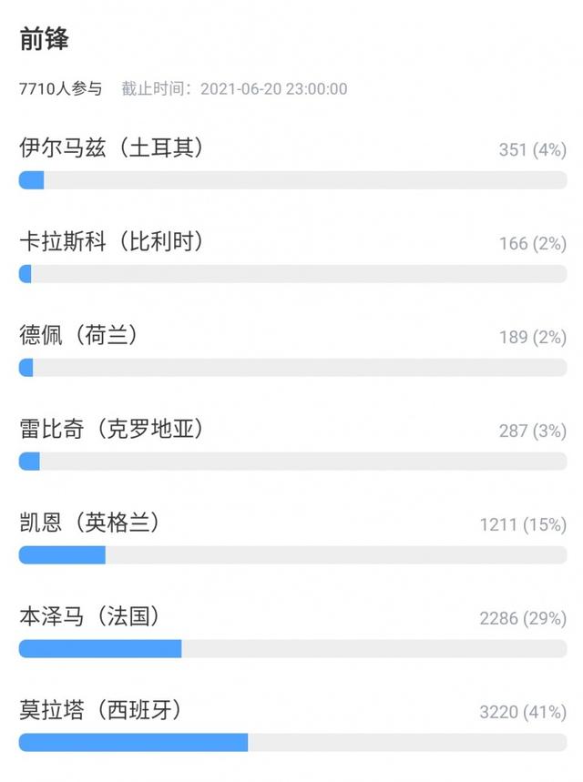 锋线位置,饱受球迷调侃的西班牙前锋莫拉塔(41.76%),本轮再度进入黑榜最衰阵。而在匈牙利1-1法国一役里多次浪费机会的本泽马此次也“不幸背锅”,获得29.65%的得票率。另外在英格兰0-0闷平苏格兰的比赛里全场无射正的英格兰前锋凯恩,也获得了吧友15.71%的选票,入选最衰阵。