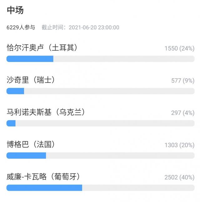 中场位置上,在葡萄牙2-4不敌德国的比赛里表现不佳的后腰球员威廉-卡瓦略,获得40.17%的得票率,成为本轮最衰中场。另外,延续首轮低迷状态的土耳其中场恰尔汗奥卢(24.88%)连轮入选,以及上轮进入红榜的博格巴因在匈牙利1-1法国的比赛里发挥欠佳,获得20.92%的得票率。