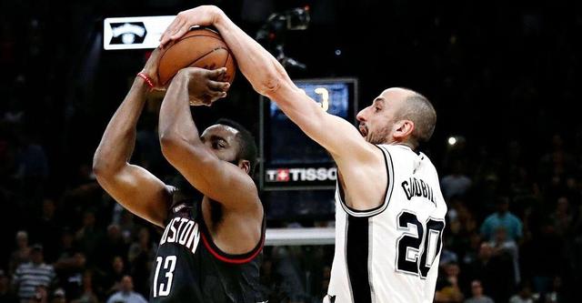 17年对阵马刺的天王山之战,全场梦游的哈登最后时刻被40岁的吉诺比利绝杀大帽。