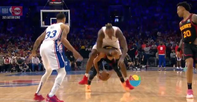 老鹰G7对阵76人,第二节特雷-杨快攻推进急停刹车,身后追防的德怀特-霍华德撞上,直接从特雷-杨头上跳了过去,被吹犯规。