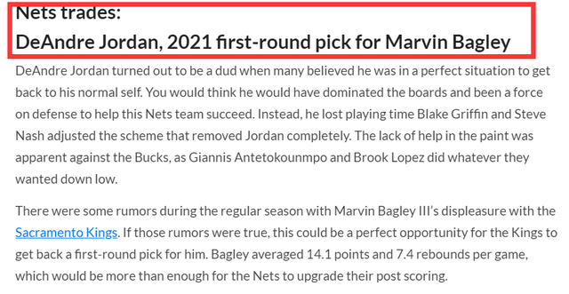 除此之外,小乔丹已经在纳什的体系中跌出轮换,篮网管理层肯定会送走小乔丹,换来能弥补篮网阵容深度的球员,记者Benedetto Vitale提议,篮网可以将小乔丹和2021年首轮签打包,交易来国王的悍将马文·巴格利,尽管马文·巴格利是国王18年的榜眼秀,但是他与国王的矛盾加剧,国王会送走他顺便回收首轮签,加之今天是选秀大年,2021年的首轮签也很有价值。马文·巴格利上赛季的场均数据为14.1分和7.4个篮板。国王处于重建阶段,小乔丹的合同还剩余两年,且薪金不高,不会对国王的薪金空间带来丝毫压力。