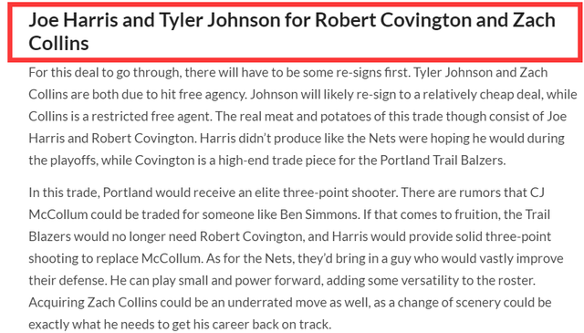 此外,乔哈里斯在季后赛表现糟糕,可能会让管理层对他失去耐心,此外,篮网需要需要侧翼顶级的3D球员,具备一定的3分能力和防守能力,美媒《clutchpoints》的篮球记者Benedetto Vitale撰文提议,篮网应该送走乔哈里斯和泰勒约翰逊,和开拓者交易换来考文顿和扎克柯林斯,考文顿侧翼顶级的3D球员,火箭时期,他和火箭搭档打出了巅峰表现,场均得到12.8分,而柯林斯是2米13的大个子,能很好保护篮网禁区,这两人的属性是篮网需要的!