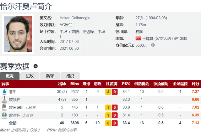 现年27岁的恰尔汗奥卢,本赛季一共为米兰出战了33场意甲的比赛,其中30场首发,打入了4个进球,有9次助攻;并出战了6场欧联的比赛,其中4次首发,打入了1个进球。恰尔汗奥卢与米兰的合同在本月底到期,目前球员在德转的身价为3500万欧元。