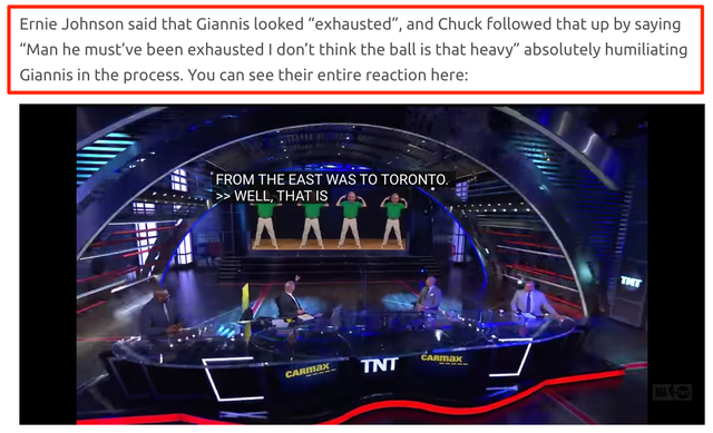 这也引起像查尔斯-巴克利,厄尼-约翰逊和其他分析师的嘲笑。厄尼-约翰逊说扬尼斯-阿德托昆博看起来已经“筋疲力尽”,巴克利接着说道:“伙计,我一定是筋疲力尽了,但我认为篮球没那么重。”