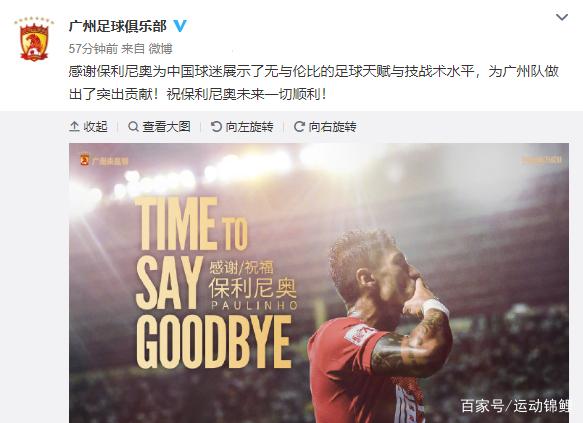在这样的前提条件下,保利尼奥则是在深夜发文+录视频与广州队告别,他先是在个人社交媒体上发布了一条帖文,他表示自己足球生涯最重要的一个阶段之一走到了尽头,不过他是带着“任务完成”的心情与广州队告别的,最后他还特别感谢了广州足球俱乐部、广州队友们以及在中国交到的朋友。