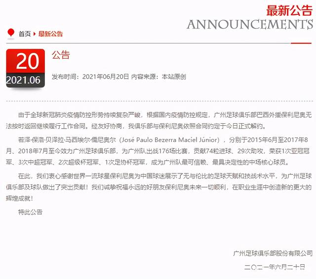 保利尼奥正式离开广州队了!广州队官方发布了一则公告,消息里指出广州足球俱乐部与保利尼奥正式解约,具体原因就是全球疫情形势非常严峻,这导致保利尼奥无法按时返回继续履行工作合同,双方经过友好协商之后共同做出了这个决定!