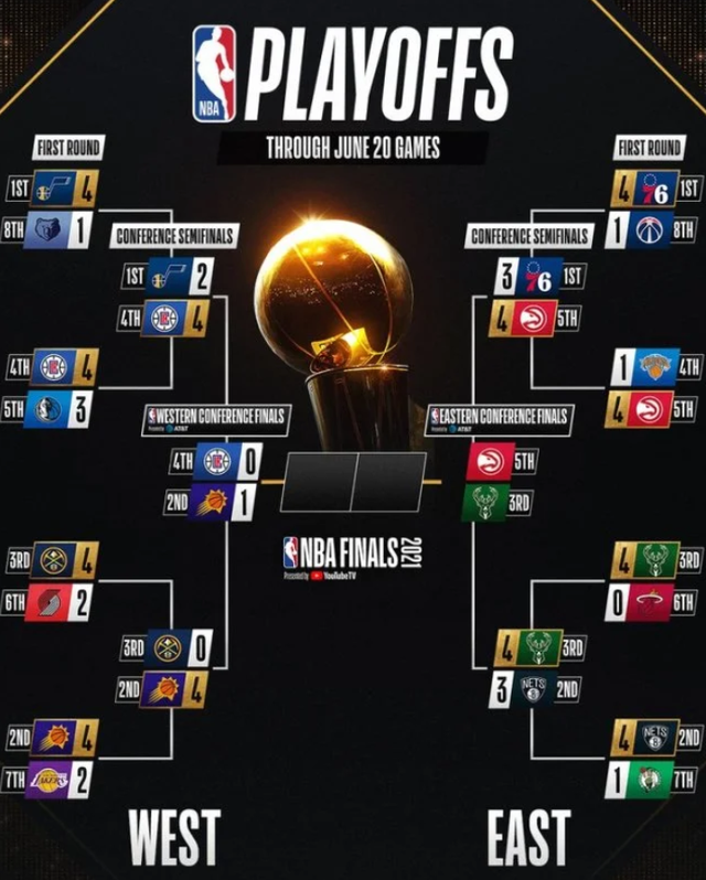 随着老鹰在抢七大战中击败费城,这样一来,东西部晋级决赛的球队已经全部产生了。西部这边是太阳和快船,并且太阳目前已经大比分1-0领先快船;东部方面则是雄鹿对阵老鹰。值得一提的是,剩余4支球队中,上一次有球队夺冠还是1971年的雄鹿,当时雄鹿的领军人物是贾巴尔和罗伯特森。另外老鹰上一次夺冠则是1958年,当时老鹰的名字还是圣路易斯老鹰,而不是现在的亚特兰大老鹰。至于西部的太阳跟快船,队史则从未夺得过总冠军。