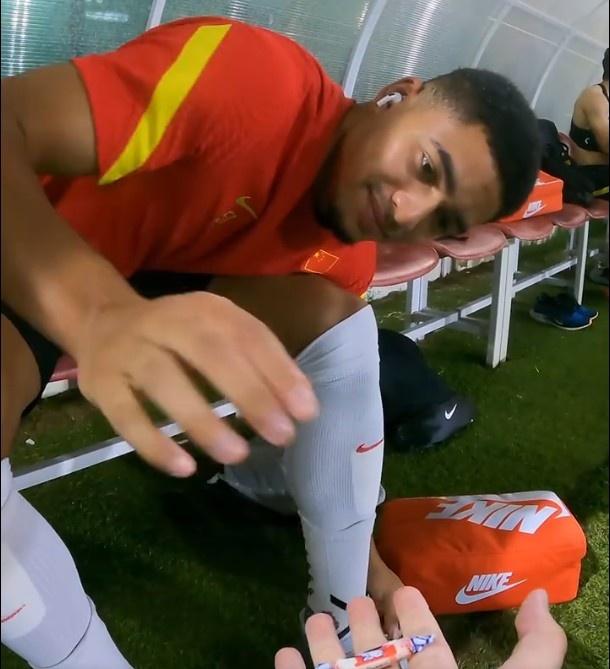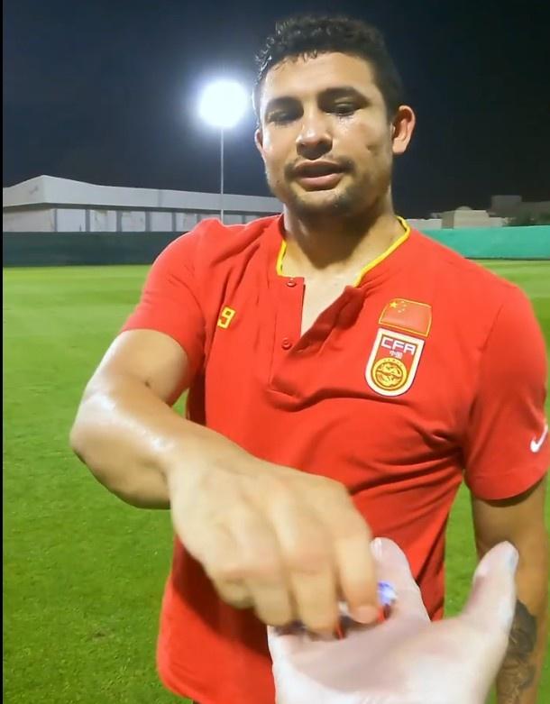 直播吧6月21日讯 今日,国足官博发布了一段国足在阿联酋沙迦训练后的视频片段,视频中众国脚在“击拳挑战”后收到礼物,其中几位入籍球员中文致谢。
