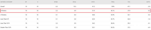 克劳德的防守能力非常不错,进入季后赛,对手面对克劳德的投篮命中率会总体下滑5.9%,只有41.2%。三分射手面对的克劳德时状态更是大跌。投篮命中率连30%都不到,克劳德没有顶尖的运动天赋,他靠的就是力量对抗以及预判能力。他的每一次防守都很到位。