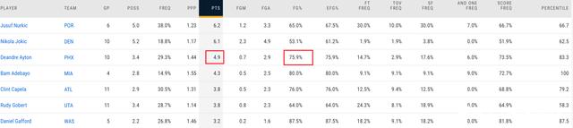 一项最有说服力的数据:今年季后赛艾顿利用挡拆内切这一进攻方式场均得分接近5分,排在季后赛所有球员第3位。他挡拆内切时的命中率是可怕的75.9%。结合得分和产量,艾顿的内线终结效率在所有球队中属于第1档。