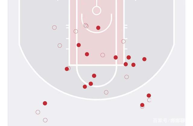 就以本场比赛为例,布克光是中距离得分就接近总得分的一半。投篮图上我们可以看到,布克的投篮分布极广,大部分都集中在弧顶区。在这个区域,布克会叫挡拆掩护直接换防。如果快船的中锋球员不到外线干扰布克就会直接投篮,效率高得惊人。