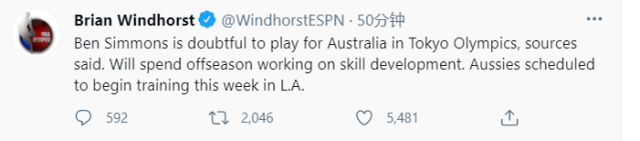 哈登这边宣布参加奥运会,西蒙斯却做出了相反的决定,他可没有受伤, 据名记Brian Windhorst报道,消息人士透露,本-西蒙斯不太可能(doubtful)代表澳大利亚参加东京奥运会。本西将在休赛期致力于提高各项技能。澳大利亚男篮计划本周在洛杉矶开始训练,76人被淘汰后,西蒙斯被喷惨了,作为nba季后赛历史上罚球最差的球员,西蒙斯赛季直言想留在76人,如果继续没有进步,他的好兄弟恩比德肯定不能相信过程了吧。
