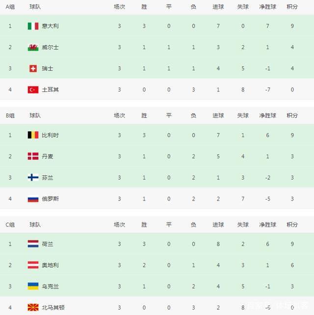 这个比赛日,B组,芬兰是小组第3,只有3分;C组,乌克兰是小组第3,也只有3分。因此,欧洲杯积4分或者以上的球队,都出线了。