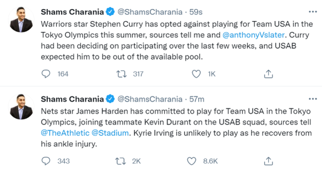北京时间6月22日,据名记查拉尼亚报道,篮网球星哈登已经承诺加入美国男篮,参加东京奥运会。他和杜兰特将在奥运会上再次联手,欧文需要时间养伤,不大可能参加奥运。另外,查拉尼亚还报道称,勇士球星库里经过几周的思考,最终决定不参加奥运会,而美国男篮也已经为此做好准备。爵士球星米切尔需要养伤,同样决定不参加奥运会。