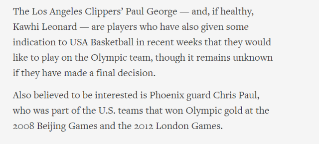 那么接下来还会有哪些球星加入这支国家队呢?美联社报道称,快船的乔治、莱昂纳德(恢复健康的前提下)都会考虑加入,但目前尚未做出决定。另外,太阳的后卫保罗也有兴趣成为其中一员。美国男篮希望这位老将能够加入,他曾在2008年和2012年的奥运会上随队夺得冠军。