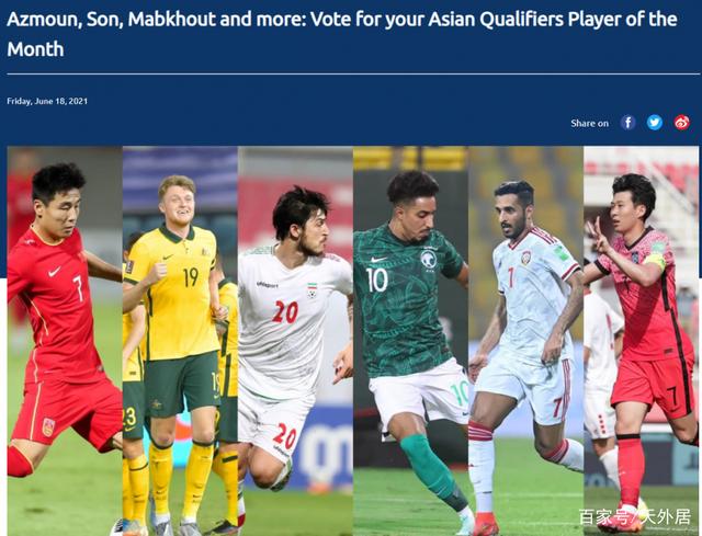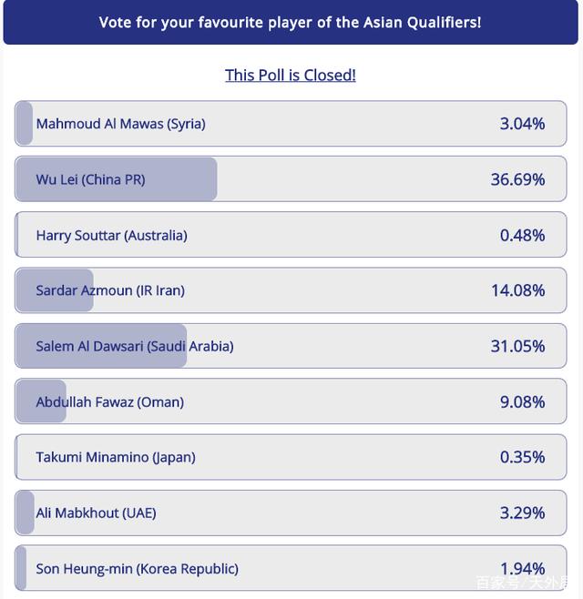 其他球员方面,沙特球星萨勒姆31.05%排名第二位,伊朗头号球星阿兹蒙14.08%排名第三,之后则是阿曼的法瓦兹、阿联酋的马布霍特、叙利亚的马瓦斯,亚洲一哥孙兴慜仅仅排名第七位,获得1.94%的支持。垫底的是日本球星南野拓实,在候选人中获得0.35%的支持。