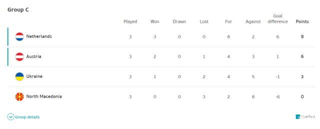 C组最终积分榜:荷兰、奥地利出线,乌克兰、北马其顿出局