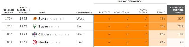 除此之外美媒FiveThirtyEight还预测老鹰击败雄鹿晋级东决的概率只有24%,他们的夺冠概率只有4%。这是不是想起了15-16赛季骑士1-3落后勇士那3%的夺冠概率?
