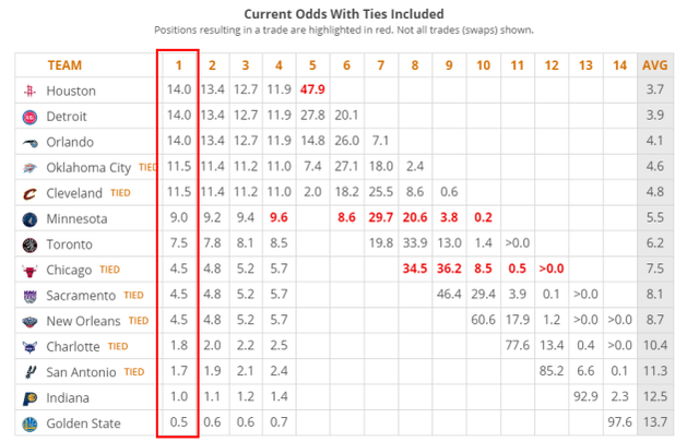 照目前的情况来看,凯德-坎宁安是今年的状元大热门。各队在各个位置的抽签概率如下表——