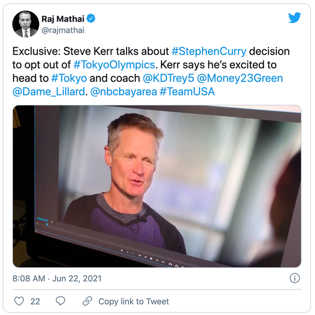 首先勇士当家巨星斯蒂芬-库里宣布不会参加今年东京奥运会,勇士主教练史蒂夫-科尔在接受采访时透露了这一消息,并且指出库里“需要休息”:
