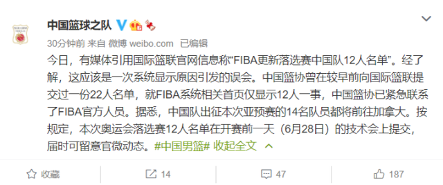 中国篮球之队写道:“有媒体引用国际篮联官网信息称“FIBA更新落选赛中国队12人名单”。经了解,这应该是一次系统显示原因引发的误会。中国篮协曾在较早前向国际篮联提交过一份22人名单,就FIBA系统相关首页仅显示12人一事,中国篮协已紧急联系了FIBA官方人员。”