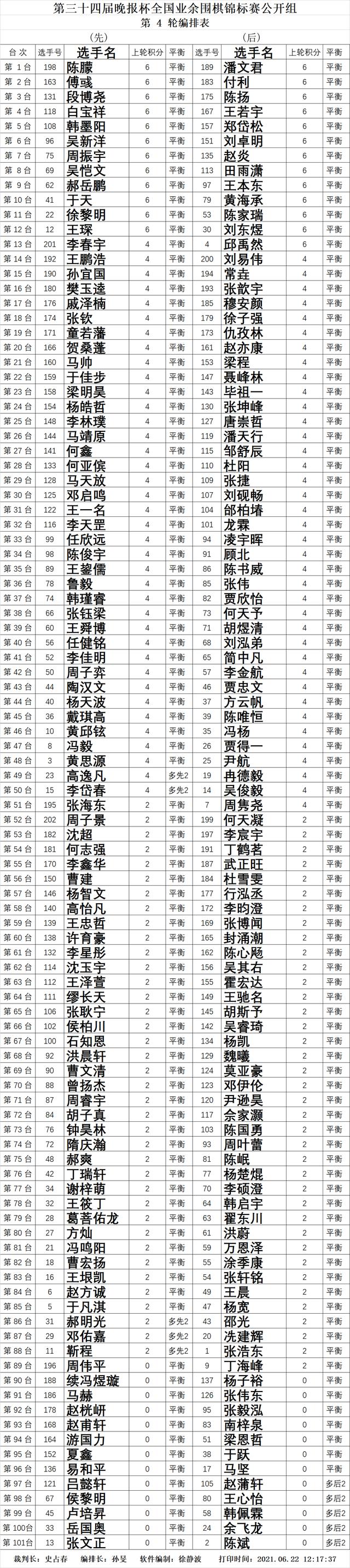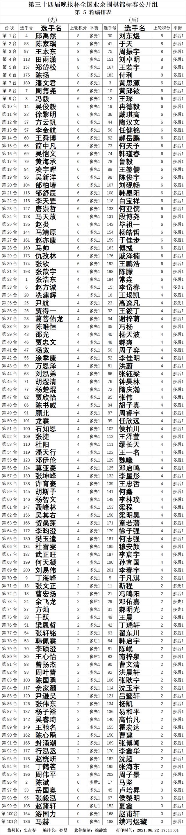 今日进行第了第3至6轮的比赛,其中第4轮和第5轮为快棋赛,最终潘文君、陈扬、刘卓明、郑岱松、周振宇、邱禹然、于天七名选手五战全胜领跑全场,陈俊宇、王琛等31人四胜一负紧随其后,夺冠热门何鑫、胡煜清、唐崇哲、马天放、杜阳等强豪仅获得6分,早早的退出了争冠行列。