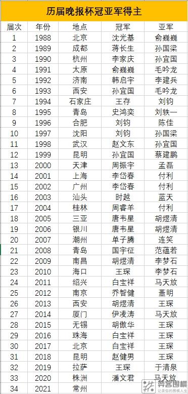 创办于1988年的“晚报杯”全国业余围棋锦标赛由中国围棋协会和中国体育记者协会晚报分会联合主办,是国内首个业余围棋大赛,有“中国业余围棋界头号赛事” 的鼎鼎大名,也是目前国内规模最大、规格最高的业余围棋赛事,参赛选手均为各地选拔出的业余围棋高手,代表当地晚报队组队参赛。从“晚报杯”上也走出了唐韦星、周睿羊、时越3位世界冠军和连笑等优秀职业棋手。