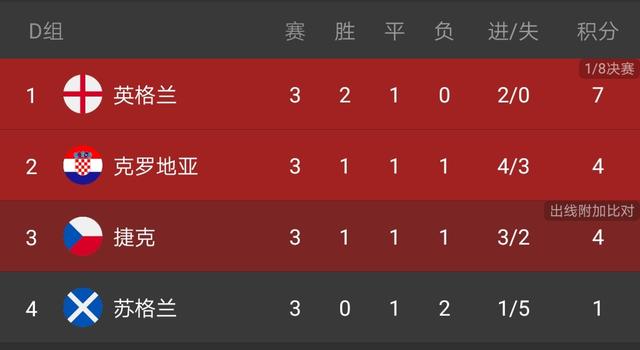 同时进行的小组另一场比赛,世界杯亚军克罗地亚在面对只有取胜才能晋级的不利局面,实现自我救赎,球队上下众志成城,破釜沉舟,终于引来一场胜利,皇马中场莫德里奇发挥出色传射建功,帮助球队3:1力克对手苏格兰,由于捷克输球,克罗地亚凭借进球多优势,喜获小组第二,拿到了英格兰与捷克梦寐以求的小组第二名额,三队携手晋级本届欧洲16强。