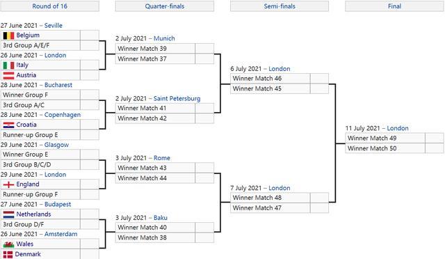 所以英格兰如果按大家的剧本拿小组第二,那确实1/8决赛不会碰法德葡,但进了8强之后,他们很可能就会碰上法国(F组第一),假设赢了法国,半决赛对手大概率就是比利时或意大利,想要进决赛非常困难。D组小组第二想要打进决赛的淘汰赛理论最惨赛程是连碰西班牙、法国、意大利(比利时。
