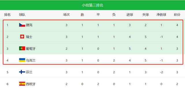 小组赛第三名排名在葡萄牙身后的乌克兰3轮过后积3分打进4球丢了5球,净胜球-1;芬兰3轮过后也是积3分,进1球丢3球,净胜球-2;本届欧洲杯6个小组第三名排名前四的晋级16强,净胜球相同的进球多的排名靠前,所以葡萄牙即便输球也是有较大概率晋级的,只要不输法国超过2球。E组则形势复杂,西班牙状态不稳定,波兰有反弹趋势,很难判断谁能拿到最后的晋级名额。