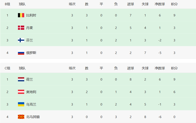 B组竞争形势更为复杂一些,只有比利时一骑绝尘,3连胜拿到9分,以第一名身份晋级16强,第二名的丹麦只有3分,凭借净胜球优势力压同样积3分的芬兰和俄罗斯,惊险晋级本届欧洲杯16强,上演了丹麦童话。芬兰获得第三名,打进1球丢了3球;俄罗斯垫底,打进2球,狂丢7球。