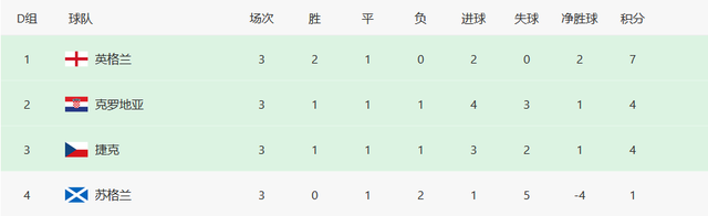 D组,英格兰2胜1平不败拿到7分,以小组第一身份晋级;克罗地亚1胜1平1负积4分,打进4球丢3球以进球优势力压捷克拿到第二名,顺利晋级16强;捷克1胜1平1负积4分,打进3球丢2球,以较好的小组第三名身份晋级16强,苏格兰1分垫底,无缘16强。