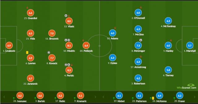 克罗地亚首发:1-利瓦科维奇6.9、22-乌拉诺维奇6.7、21-维达6.5、6-洛夫伦6.9、25-格瓦尔迪奥尔6.6、8-科瓦西奇7.7、10-莫德里奇8.1、11-布罗佐维奇7.0、13-弗拉西奇8.0、4-佩里西奇8.3、20-佩特科维奇6.4