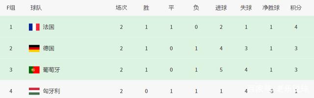 两轮过后,德国队一胜一负暂列第二,最后一轮将会面对匈牙利,如果德国队赢球,那么将会积6分,直接晋级,或许法国和葡萄牙打平,德国队将会以小组第一出线,如果法国队战胜葡萄牙,德国队在获胜的情况下,也能小组第二出线。