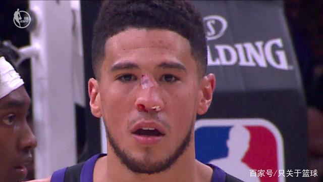 除此之外,卢指导还派上了“疯狗”贝弗利去撕咬布克。这个撕咬是真的撕咬,两人一次头对头的碰撞把布克的鼻子都打歪了,血洒赛场。