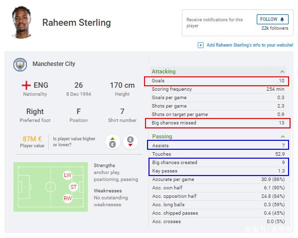 从统计数据可以看到,上赛季英超赛场,斯特林打入10球,同时错失13次绝佳机会。